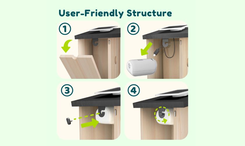 Das Birdfy Vogelhaus verfügt über eine 1080P-HD-Kamera, die jeden Moment des Nestbaus, Schlüpfens und Interagierens der Vögel einfängt. Mit KI-Verhaltensanalyse erkennt die Kamera automatisch wichtige Momente wie Nestbau und Gefiederpflege und erstellt faszinierende Vogelgeschichten, die Sie genießen und mit Familie und Freunden teilen können.