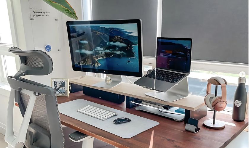 Der mStand hebt Ihr MacBook auf eine bequeme Augenhöhe, was hilft, eine ergonomische Haltung beizubehalten und Belastungen im Nacken- und Schulterbereich zu verringern. Durch die Kombination mit einer externen Maus und Tastatur können Sie ein bequemes Desktop-Setup schaffen, das Ihre Produktivität und Ihren Komfort steigert.