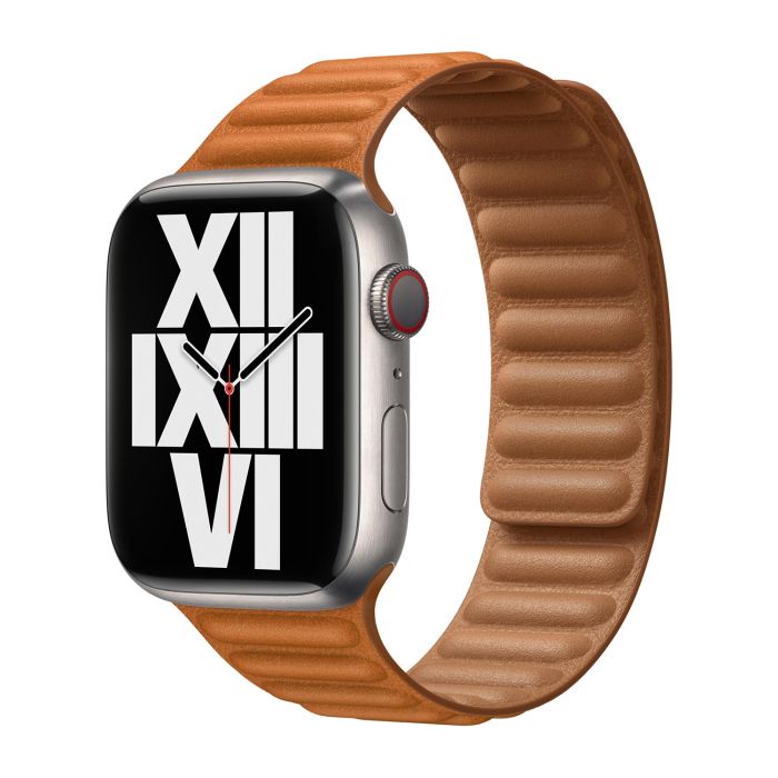 Apple Leather Link für die Apple Watch in der Farbe Golden Brown. Dieses Armband ist für alle Apple Watch Modelle in den Größen 42mm / 44mm / 45mm geeignet.