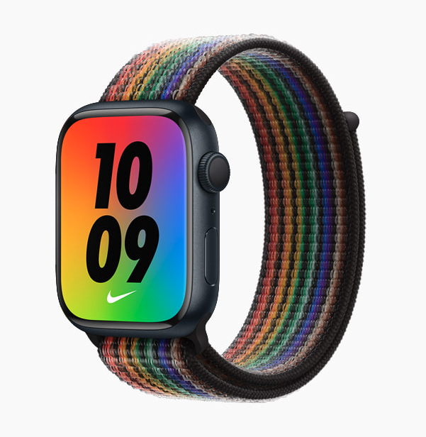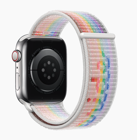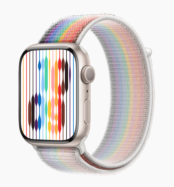 Im Frühjahr 2022 erweiterte Apple seine Pride-Kollektion mit einem Nike Sport Loop in dunklen und hellen Farben. Apple hat sich für das gewebte Sportband entschieden, weil es bequem, haltbar und leicht verstellbar ist. Das diesjährige gewebte Sportband der Pride Edition enthält eine Farbpalette, und das Wort "Pride" ist in das Band eingewebt. Apple hat dazu einige doppellagige Nylonschlaufen weggelassen, so dass das Wort "Pride" deutlich sichtbar ist. Dieses Design wurde durch den Gruß "Hallo" des ersten Apple Macintosh im Jahr 1984 inspiriert.