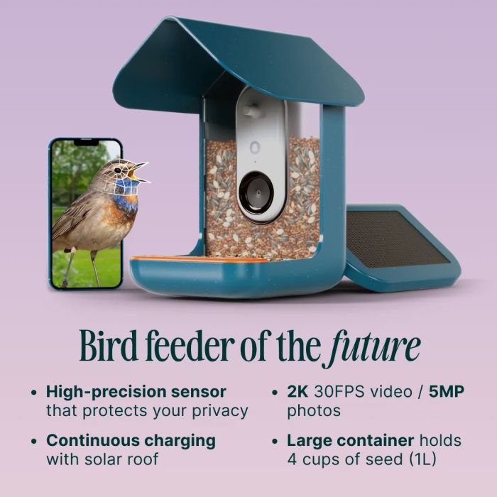 Dieser innovative Futterspender mit eingebauter smarter AI-Kamera und Solarpanels ist das ultimative Werkzeug für Vogelbeobachtungs-Enthusiasten. Der verbesserte Bird Buddy Smart Bird Feeder Pro Blau mit Solarpanel 2.0 verfügt über ein abnehmbares Solardach, das endlose Energie liefert, um jeden Vogel in atemberaubender Detailtreue einzufangen. Sehen Sie sich die Fotos und Videos jederzeit in Echtzeit an oder überprüfen Sie sie später über die Bird Buddy App auf Ihrem Smartphone.