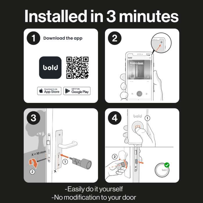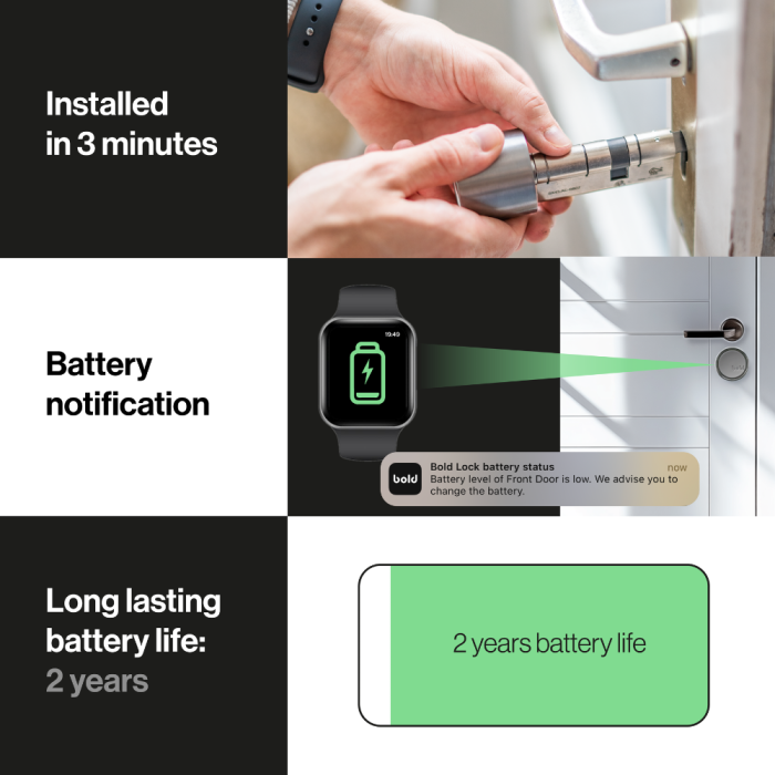 Die Einrichtung des Bold Elite ist unkompliziert und erfordert keine technische Expertise oder speziellen Werkzeuge. Einmal installiert, bedeutet die drei-jährige Batterielebensdauer des Schlosses weniger Austausch und konstante Zuverlässigkeit über Jahre hinweg.