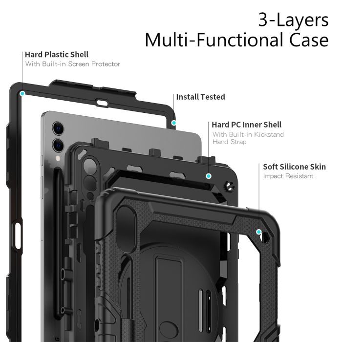 Die Hülle besteht aus mehreren Schichten, damit Ihrem Galaxy Tab S9 nichts passiert. Die verschiedenen Schichten können beim Entfernen der Hülle auseinander genommen werden. Das Gehäuse verfügt über eine eingebaute Displayschutzfolie, sodass neben der Rückseite des Galaxy Tab auch die Vorderseite geschützt ist.