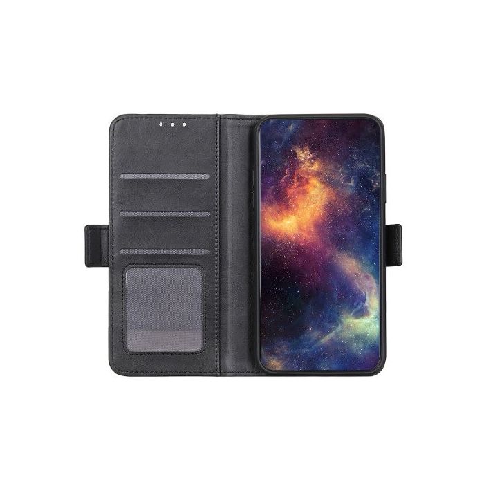 Diese Hülle hat das sogenannte Folio Design. Dies bedeutet, dass sie mit einer praktischen Klappe ausgestattet ist. Auf der Innenseite dieser Klappe finden Sie 4 Fächer. 3 schmale Fächer und 1 längliches, größeres Fach. Eines der kleineren Fächer ist zudem durchsichtig, perfekt für die Aufbewahrung von Identifikationskarten oder Fotos. In dem größeren, länglichen Fach können Sie Bargeld oder andere, etwas größere, Dinge, verstauen.