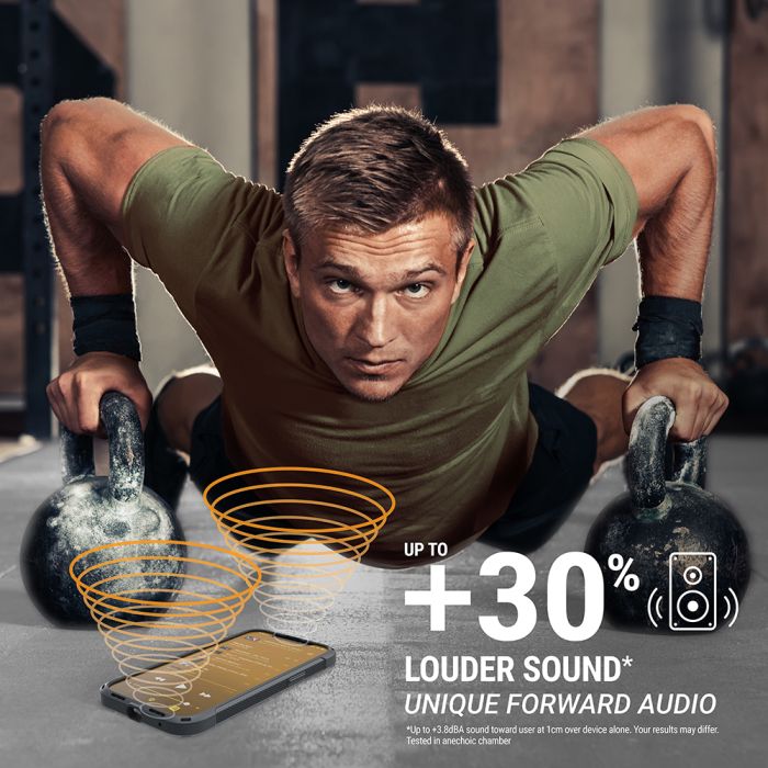 Eine der herausragenden Eigenschaften des Catalyst Vibe Case ist das einzigartige Forward Audio-Design. Indem der Klang von der Unterseite des Telefons nach vorne geleitet wird, verstärkt das Case den Sound um bis zu 30 % im Vergleich zur Nutzung eines ungeschützten Geräts. Das bedeutet klareren und lauteren Audio, wenn du Musik hörst, Videos anschaust oder telefonierst, ohne externe Lautsprecher oder Zubehör zu benötigen.