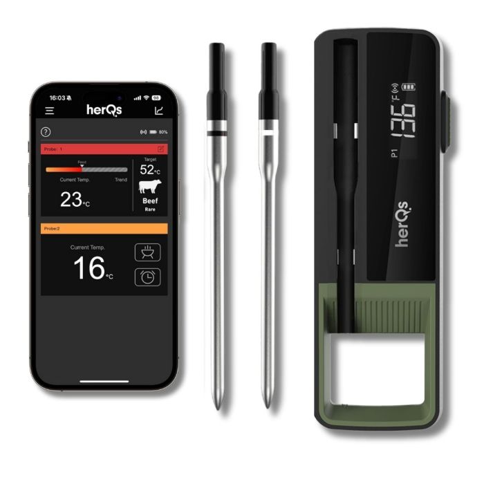 Das HerQs Double Max, ein ultradünnes drahtloses Fleischthermometer, bietet eine revolutionäre Erfahrung sowohl für Hobbyköche als auch für Profis. Das Dual-Sonden Fleischthermometer ermöglicht die Messung von zwei Fleischstücken gleichzeitig mit einem beeindruckenden Temperaturbereich von bis zu 500 Grad Celsius. Dieses fortschrittliche Thermometer verkörpert Effizienz, Präzision und Zuverlässigkeit. Nicht nur glänzt das HerQs Double Max in der Temperaturmessung, sondern mit einer Nachhaltigkeitskomponente, die bis zu 72 Stunden anhält, ist es auch perfekt für ausgedehnte Kochsitzungen geeignet.