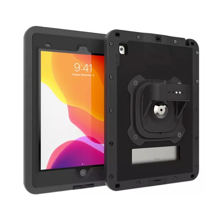 Das Joy Factory aXtion Pro MP iPad 10.2 Zoll (2019/2020/2021) schwarz ist ein robustes, wasserdichtes Gehäuse in Industriequalität mit MagConnect, drehbarem Ständer und Handschlaufe.