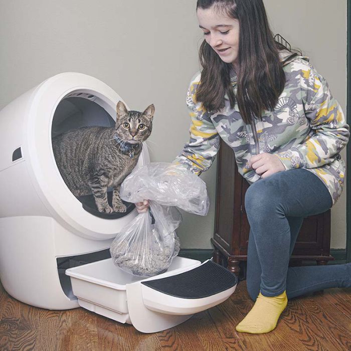 Maßgeschneiderte Müllbeutel für eine einfachere Entleerung. (Kann mit jedem Litter-Robot verwendet werden.) Die Reinigung des Litter-Robot ist so einfach wie das Herausnehmen des Behälters mit den maßgeschneiderten Müllbeuteln.