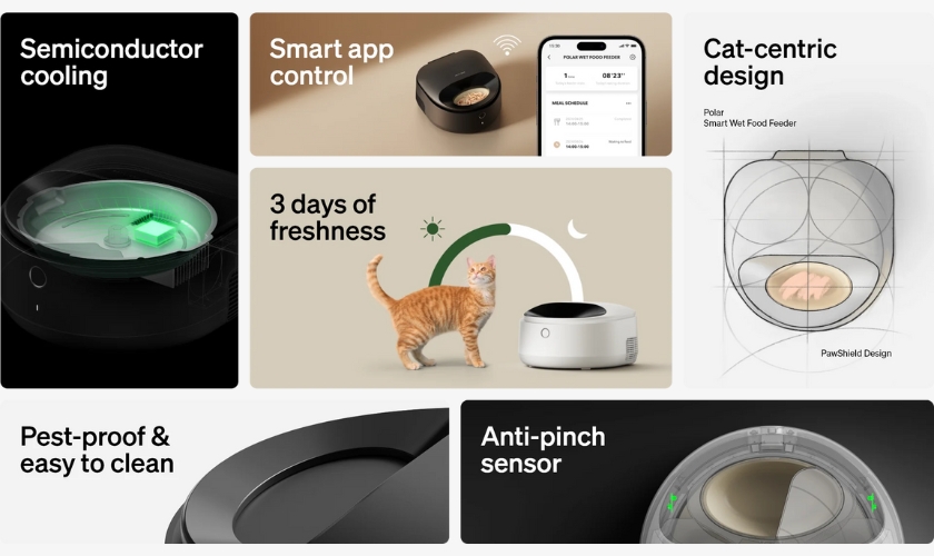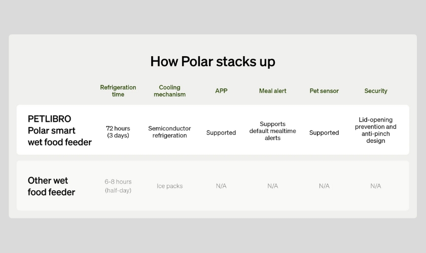 Der Petlibro Polar Nassfutterautomat verfügt über eine fortschrittliche Halbleiter-Kühltechnologie, die Nassfutter innerhalb von 4 Stunden schnell kühlt. Dieses innovative System bewahrt Feuchtigkeit und Nährstoffe und hält das Futter bei Temperaturen unter 10,0 °C bis zu 3 Tage lang frisch. Tierhalter können endlich die Freiheit genießen, nicht mehr ständig Eisbeutel austauschen zu müssen. Für eine optimale Leistung wird empfohlen, diesen automatischen Futterspender für Katzen und Hunde bei Raumtemperaturen unter 30 °C zu verwenden.