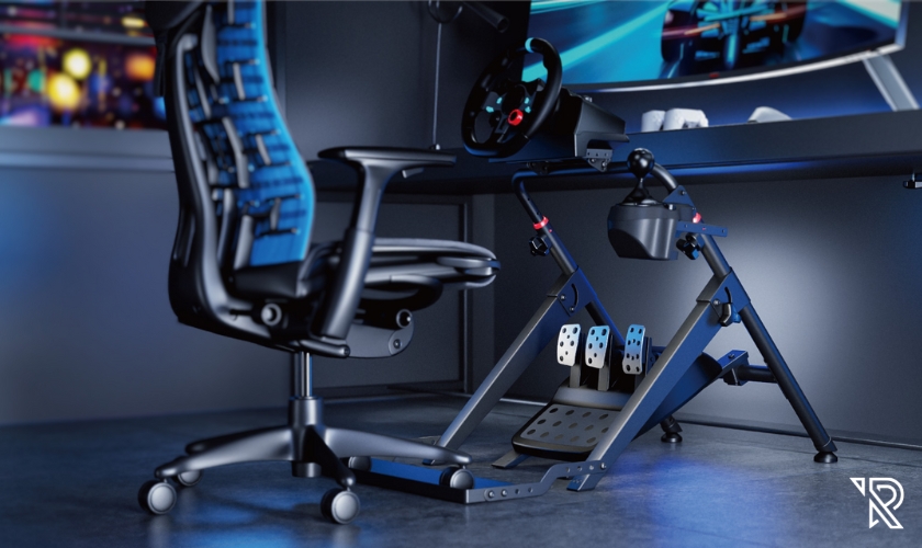 Du brauchst keinen teuren Racing-Sitz – dieser Stand funktioniert perfekt mit deinem vorhandenen Stuhl. Einfach aufstellen und losfahren.