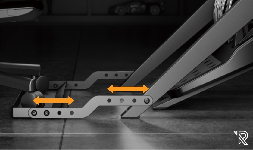 Der pulverbeschichtete Stahlrahmen erlaubt flexible Neigungseinstellungen für Lenkrad und Pedale – robust und langlebig.