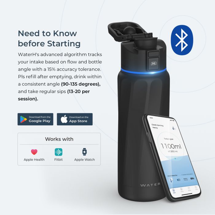 Die WaterH Boost nutzt einen ausgeklügelten Algorithmus, um Ihre Wasseraufnahme mit einer Genauigkeitstoleranz von 15 % zu verfolgen, basierend auf dem Fluss und dem Winkel der Flasche. Für optimale Ergebnisse füllen Sie die Flasche nach jedem Gebrauch nach, trinken Sie in einem konstanten Winkel (90-135 Grad) und nehmen Sie regelmäßige Schlucke (13-20 pro Sitzung). Überwachen Sie mühelos Ihre Hydration und teilen Sie die Daten bei Bedarf mit Gesundheitsdienstleistern. Setzen Sie personalisierte Ziele, synchronisieren Sie mit anderen Gesundheits-Apps und erhalten Sie einen umfassenden Überblick über Ihr Wohlbefinden. Perfekt für diejenigen, die eine präzise Hydrationsüberwachung benötigen, wie Herz- oder Nierenpatienten. Die WaterH Boost liefert maßgeschneiderte Empfehlungen zur Wasseraufnahme, die auf die Bedürfnisse Ihres Körpers zugeschnitten sind.