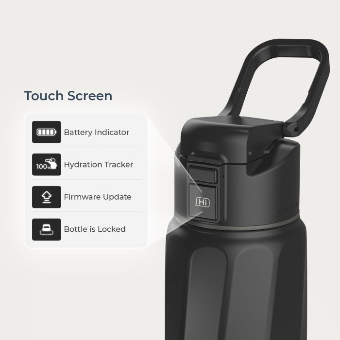 Die WaterH Boost ist mit einem intelligenten LED-Touch-Display auf dem Flaschendeckel ausgestattet, das Echtzeit-Updates zu Ihrer täglichen Wasseraufnahme und der Batterielaufzeit der Flasche bietet. Das LED-Touch-Display zeigt Ihre voreingestellten Intervalle an und sendet Push-Benachrichtigungen, die Sie an regelmäßiges Trinken erinnern, sodass Sie nie vergessen, sich zu hydrieren. Die Bluetooth-Konnektivität verbindet die Flasche mit der WaterH-App, die Ihre Hydrationsstatistiken detailliert verfolgt. Verpassen Sie nie wieder einen Schluck dank des dualen Erinnerungssystems der WaterH Boost. Außerdem begrüßt Sie die Flasche jedes Mal, wenn Sie sie öffnen, mit einem freundlichen "Hallo" und zeigt Ihren Fortschritt auf ihrem klaren digitalen Bildschirm an.