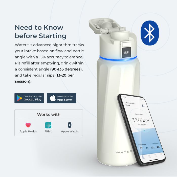 Die WaterH Boost nutzt einen ausgeklügelten Algorithmus, um Ihre Wasseraufnahme mit einer Genauigkeitstoleranz von 15 % zu verfolgen, basierend auf dem Fluss und dem Winkel der Flasche. Für optimale Ergebnisse füllen Sie die Flasche nach jedem Gebrauch nach, trinken Sie in einem konstanten Winkel (90-135 Grad) und nehmen Sie regelmäßige Schlucke (13-20 pro Sitzung). Überwachen Sie mühelos Ihre Hydration und teilen Sie die Daten bei Bedarf mit Gesundheitsdienstleistern. Setzen Sie personalisierte Ziele, synchronisieren Sie mit anderen Gesundheits-Apps und erhalten Sie einen umfassenden Überblick über Ihr Wohlbefinden. Perfekt für diejenigen, die eine präzise Hydrationsüberwachung benötigen, wie Herz- oder Nierenpatienten. Die WaterH Boost liefert maßgeschneiderte Empfehlungen zur Wasseraufnahme, die auf die Bedürfnisse Ihres Körpers zugeschnitten sind.